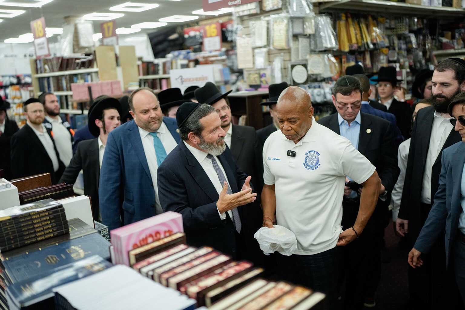 New York City Mayor Eric Adams, center right, meets with Jewish community leaders and walks through local businesses in Borough Park ahead of the upcoming Jewish High Holidays on Sept. 15, 2025. (Photo by Michael Appleton/Mayoral Photography Office)