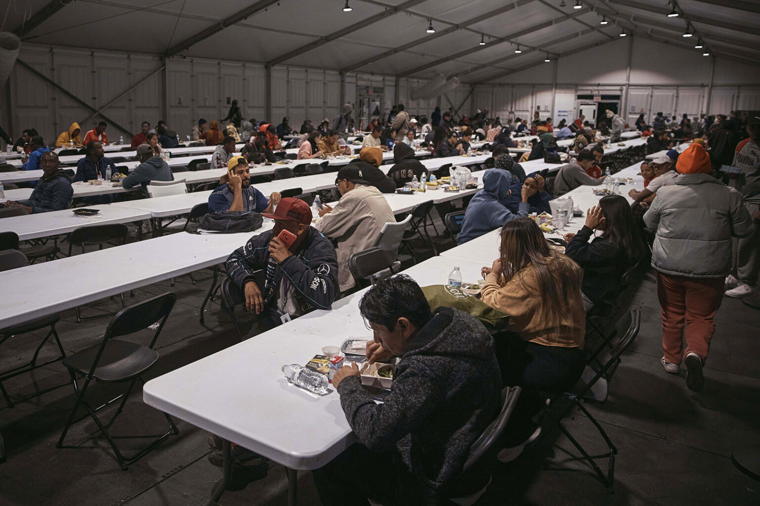 Muslims and non-Muslim migrants eat their meals together during an iftar, the sunset meal when Muslims break their fast in the holy month of Ramadan, at the migrant shelter on Randall’s Island, on April 9, 2024, in New York. (AP Photo/Andres Kudacki)