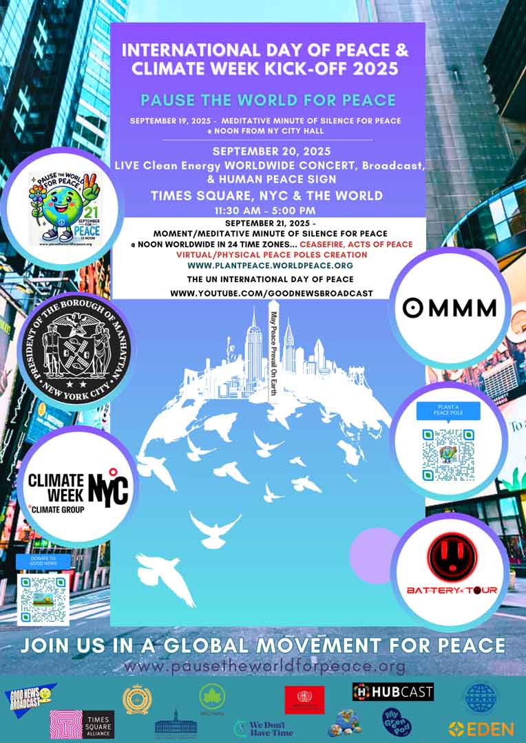 Once again, we will email you the poster and appreciation certificate for free, a SPECIAL INVITATION TO THE STEPS OF NYC CITY HALL on Friday, September 19th, for a HISTORIC RINGING OF THE FOWPAL PEACE BELL BY MAYOR ADAMS, HOLD SIGNS OF PEACE AND MOTHER EARTH, and/or YOUR COMPANY. WE ARE FINISHING WITH THE SCHOOLS OF NEW YORK CITY FOR THEM TO TAKE A MOMENT/MEDITATIVE MINUTE OF SILENCE FOR PEACE. Your tax-deductible donation to our UNITED Peace & Mother Earth Movement can surely help us pay for this very expensive production weekend. IMPORTANT NOTE: A few donor/sponsor opportunities are still available, and our goal is NOW $15,000 in total, which is a tax-exempt deduction, for direct production expenses to create our NETWORK QUALITY LIVE CLEAN ENERGY BROADCASTS.