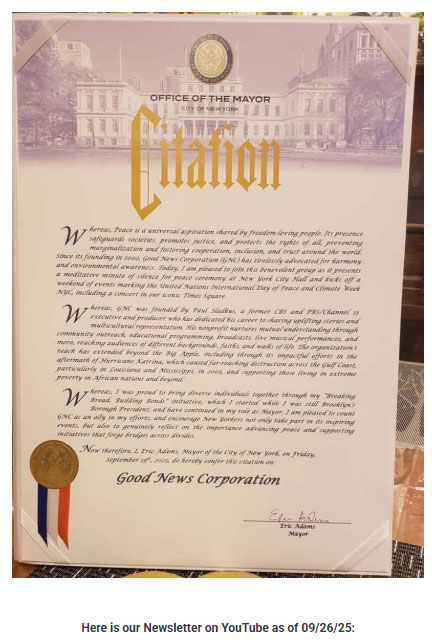 Founder, Good News Corporation 501 C 3 212 647 1212 paul.sladkus1@gmail.com and our Good News and Peace Worldwide Team who make our Peace Day 9/21 happen.