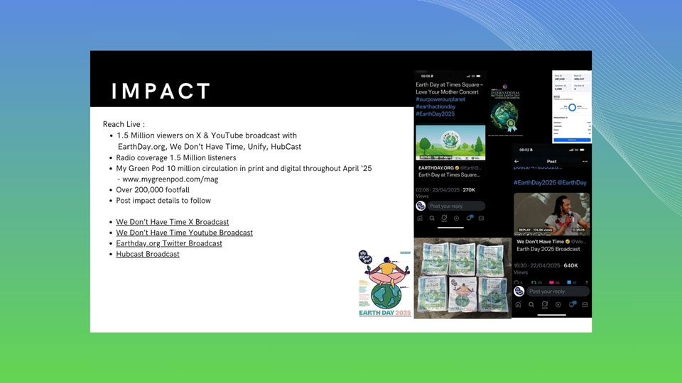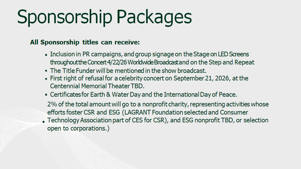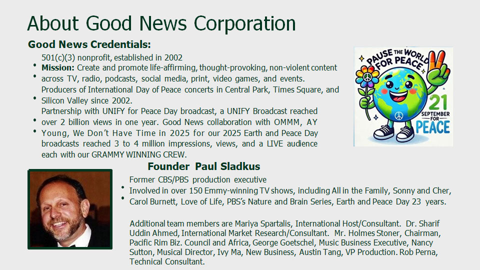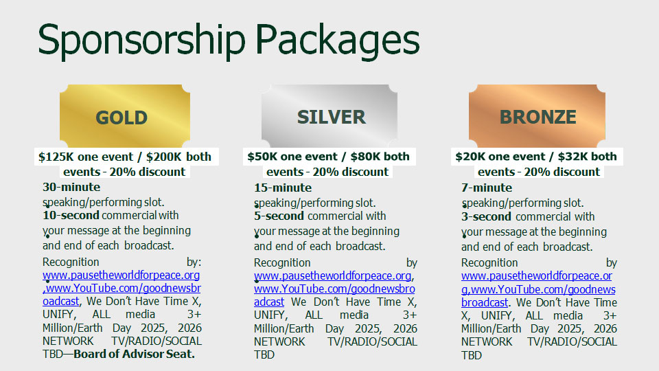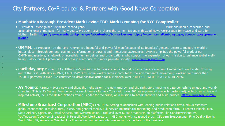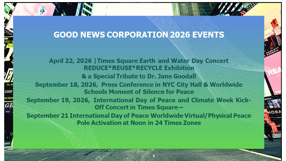 2025 will be a booming year to show that you, your company or your organization cares about MOTHER EARTH AND PEACE through the donor opportunity from Times Square on April 22, 2025 (Earth & Water Day) and September 21, 2025 (Peace and Climate Week Kick Off).